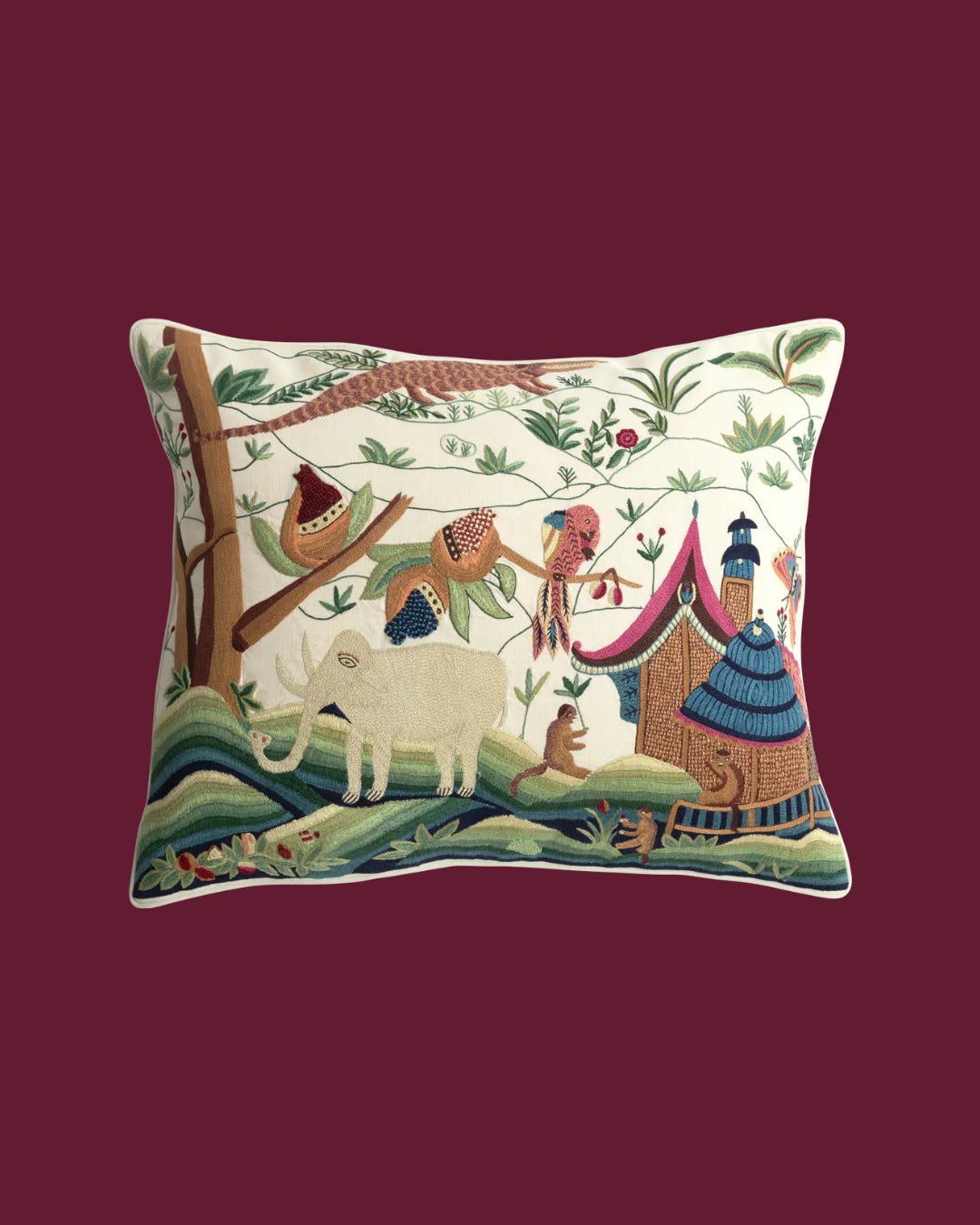 I spotted this embroidered pillow at William Laman earlier this week, and it took every ounce of self-restraint not to walk out with it. The 18th-century-inspired jungle scene (that elephant! those monkeys!) would bring a little far-flung adventure wherever it lands.