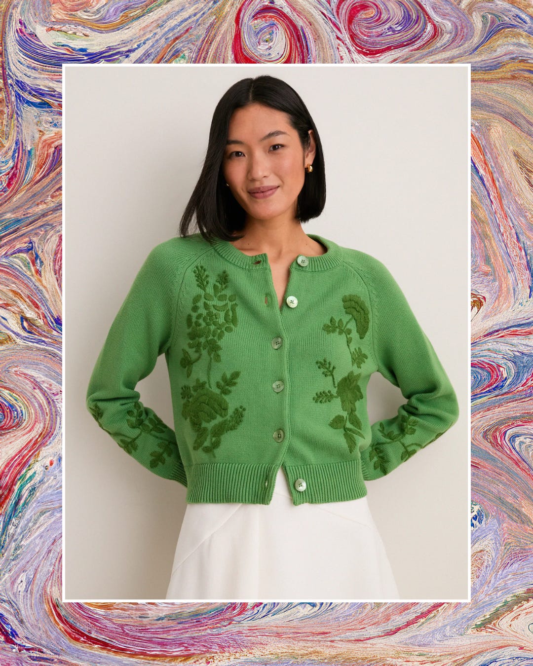 This pistachio sweater with its floral embroidery was immediately added to cart. It would be darling for spring—the green on green feels so fresh!