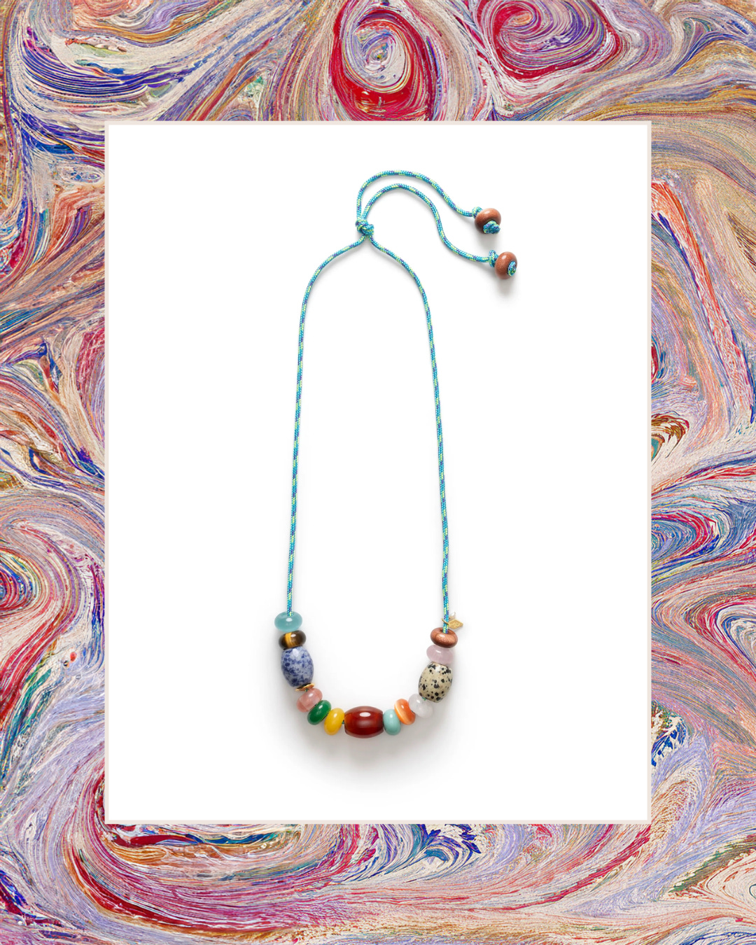 This playful necklace by Danish jewelry brand Annie Lu has me dreaming of summertime. The long paracord strand is decorated with a mess of semiprecious stones (jade, tigers eye, rose quartz…!) and would be a dream paired with white linen.