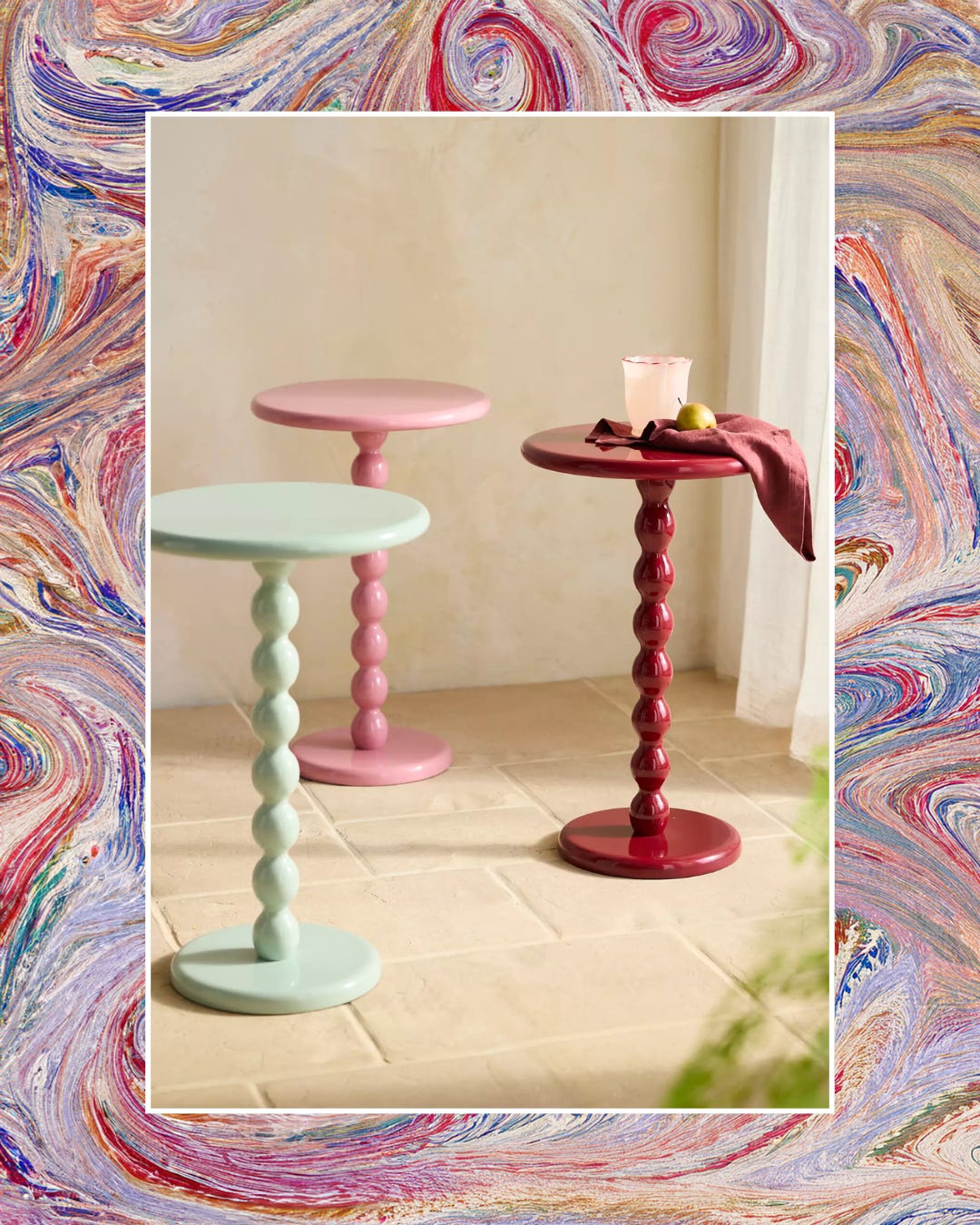 These happy bobbin side tables would be great fun indoors or out. Made of wood with a shiny lacquered finish, they’re the perfect spot to rest a cocktail or display your favorite plant.